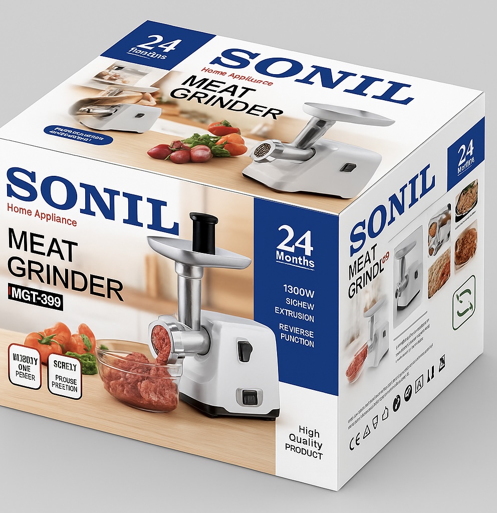 چرخگوشت سونیل مدل MGS-1685 دستگاهی طراحیشده برای استفادهٔ خانگی است که با موتور قدرتمند ۱۸۰۰ وات و ساختار مهندسیشده، سرعت و کیفیت چرخکردن گوشت را بهطور محسوسی افزایش میدهد. این دستگاه با توانایی چرخکردن تا ۱.۹ کیلوگرم گوشت در دقیقه و تیغهها و شبکههای فولادی ضدزنگ، یک انتخاب کامل برای تهیهٔ انواع کفته، سوسیس خانگی، چرخکردن گوشت برای کتلت و حتی خردکردن سبزیجات و پنیر در حجمهای مناسب است.